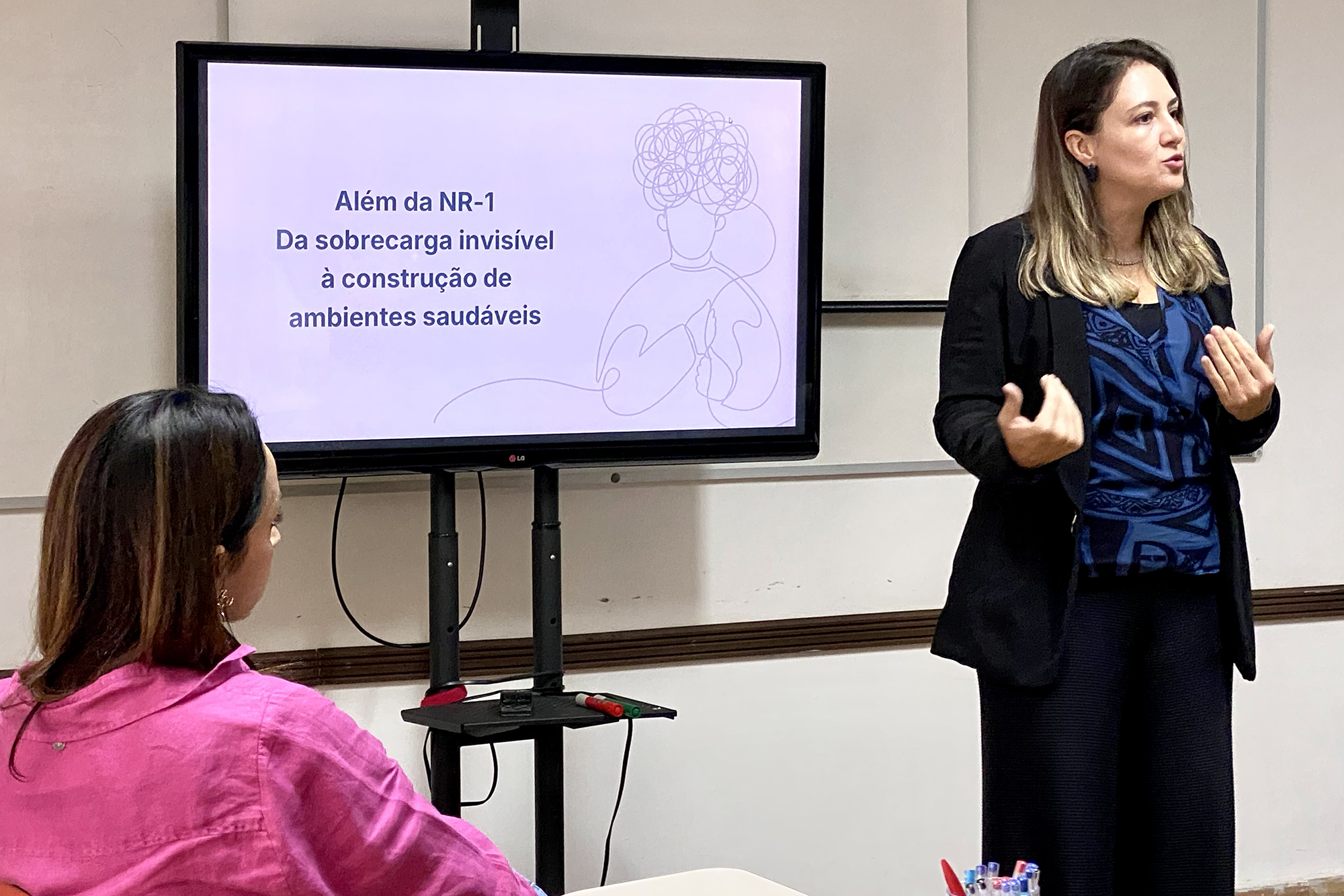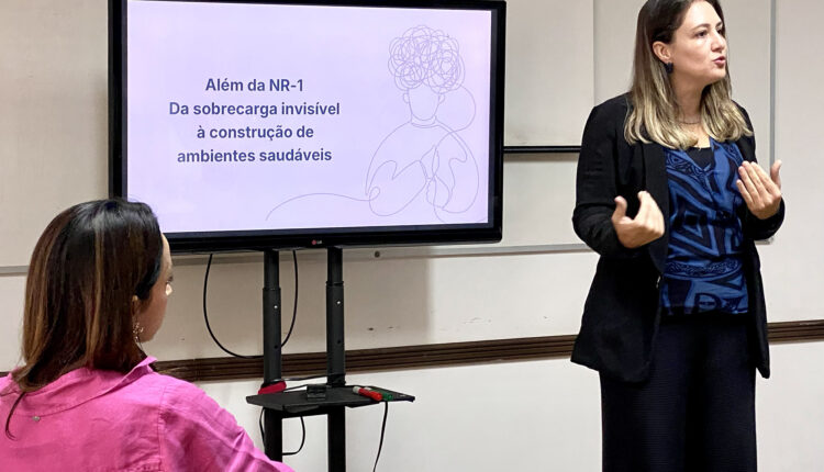 Durante a apresentação, Flávia trouxe um panorama sobre a Norma Regulamentadora nº 1 (NR-1), destacando os principais desafios enfrentados pelas instituições de ensino na adequação às exigências legais, especialmente no que diz respeito à saúde mental dos colaboradores e à prevenção de conflitos no ambiente de trabalho.